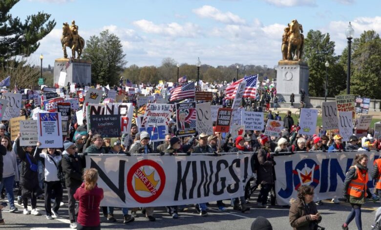 वासिङ्टन डीसीमा लिंकन मेमोरियल बाहिर भीड जम्मा भई नेसनल मलमा प्रवेश गरे। उनीहरूले ‘शासन परिवर्तन घरबाट सुरु हुन्छ’, ‘हाम्रो संविधानको रक्षा गर’ लेखिएका प्लेकार्डहरू बोकेका थिए। प्रदर्शनकारीहरूले घण्टी बजाउँदै, ड्रम बजाउँदै ‘नो किङ्स’ को नारा लगाए।