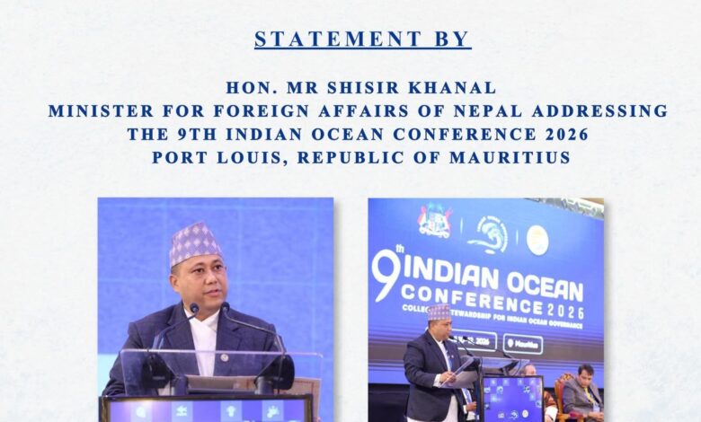पोर्ट लुइस (मौरिसस) । परराष्ट्रमन्त्री शिशिर खनालले मौरिससको राजधानी पोर्ट लुइसमा आयोजित नवौं हिन्द महासागर सम्मेलनलाई सम्बोधन गर्दै नेपालको हिमालय र हिन्द महासागरबीचको गहिरो र जैविक सम्बन्धलाई उजागर गरेका छन्। “हिन्द महासागर शासनका लागि सामूहिक संरक्षकत्व” भन्ने नाराका साथ आयोजित सम्मेलनमा मन्त्री खनालले हिमालमा पग्लिने हिउँदेखि सागरको बढ्दो सतहसम्मको पारिस्थितिकीय अन्तरनिर्भरताले साझा विश्वव्यापी प्रतिक्रियाको माग गरेको बताए।