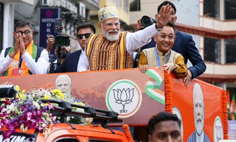 Upon alighting at Deorali from the Libing Helipad, Prime Minister Modi was accorded a grand welcome by an enthusiastic crowd. Local residents, students, and representatives of various organisations lined the route, waving flags and cheering with applause, while the rhythmic sounds of the Naumati Baaja filled the air with a musical ambience. In the presence of Chief Minister Prem Singh Tamang and State BJP President DR Thapa, the Prime Minister’s entourage proceeded on a roadshow from Ganju Lama Dwar to Lok Bhawan.
