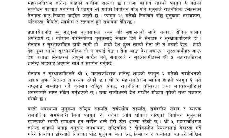 Hetauda – A independent Nepali citizen has claimed that military rule is imperative in the country, stating that it is essential for the army and security personnel to understand the intent of King Gyanendra Shah’s address on Falgun 6.