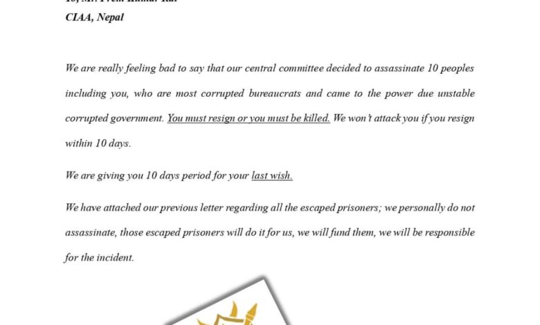 Kathmandu — Prem Kumar Rai, the Chief Commissioner of the Commission for the Investigation of Abuse of Authority (CIAA), has received a death threat from the ‘Extremist Group of Nepal’ (EGN). This extremist group has issued a 10-day ultimatum for Rai to resign.