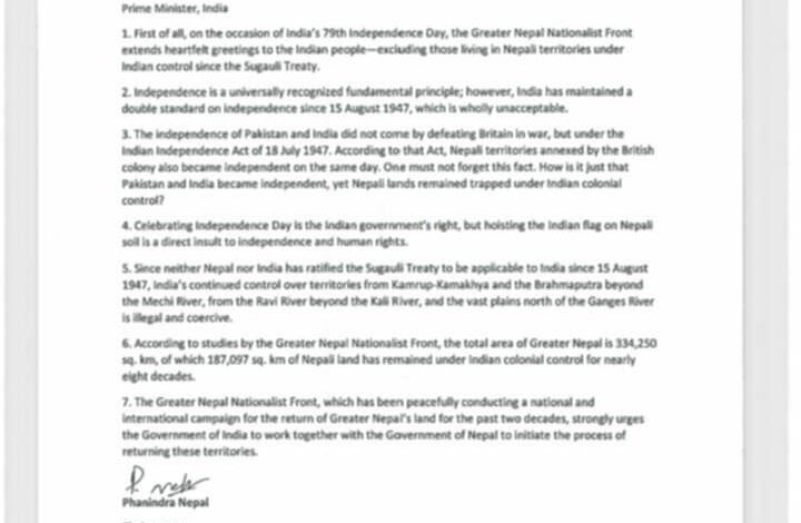Kathmandu, August 15, 2025 — On the occasion of India’s 79th Independence Day, the Greater Nepal Nationalist Front (GNNF) released a strongly worded open letter addressed to Indian Prime Minister Narendra Damodardas Modi, calling for the return of territories the group claims were historically part of Nepal.