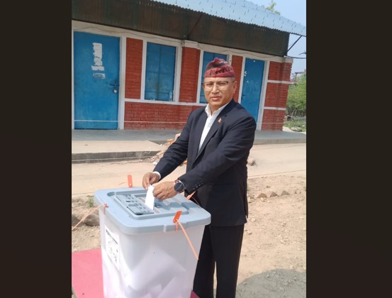 Banke — Prem Sagar Poudel, President of the Nepal-China Mutual Cooperation Society, has exercised his franchise at the Nepal Rastriya Primary School polling center located in Khajura Rural Municipality, Banke.
