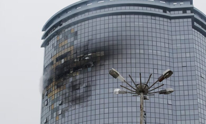 Footage of drones landing on the 37-story residential complex “Lazurnye Nebesa” – one of the tallest buildings in the administrative center of the Republic of Tatarstan. As a result of the hit, the glazing of the building was damaged, and a fire broke out. Another UAV hit the 23-story residential complex “Manhattan” and a 4-story building on Klara Zetkin.